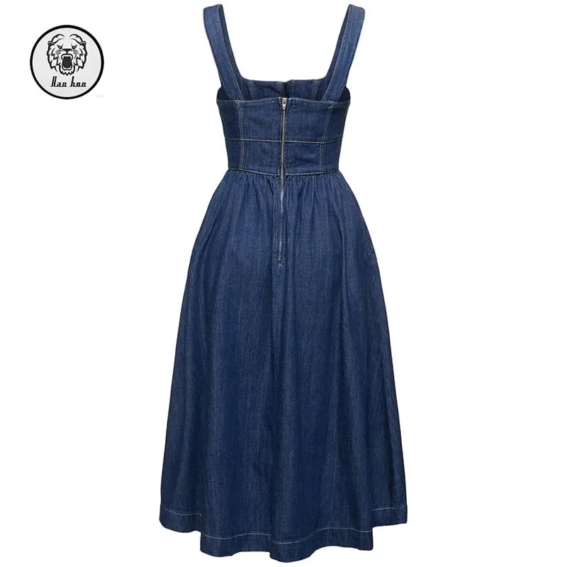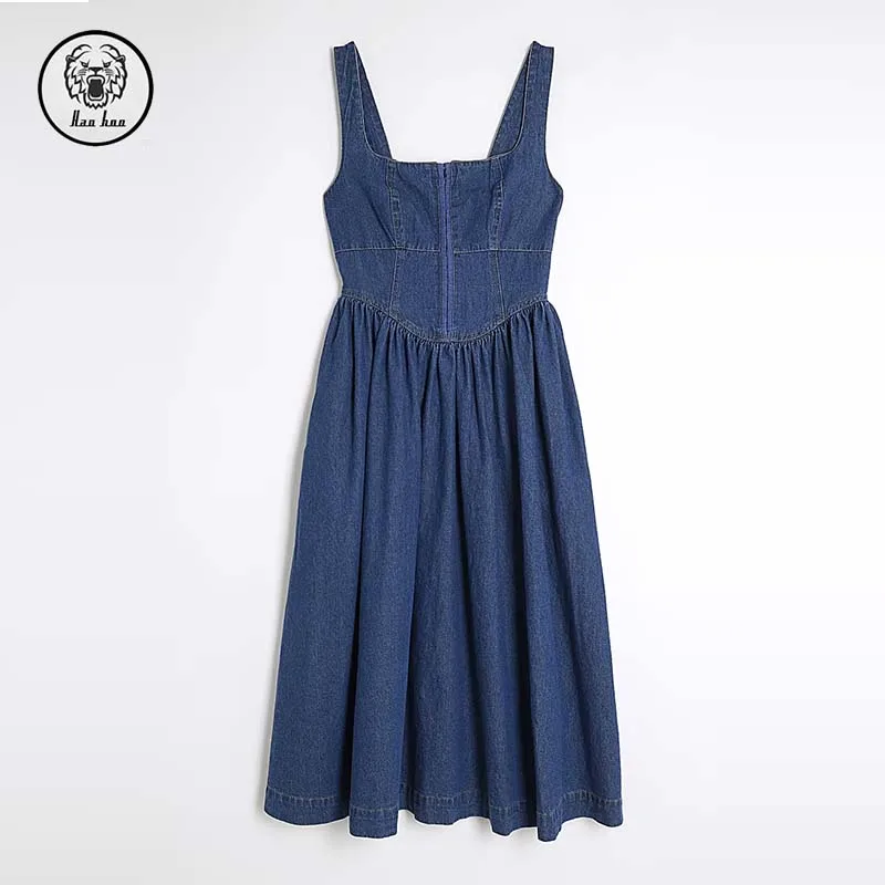 2026 New Sleeveless Blue Denim Midi Women's Dress with Square Collar Corset Design Draped and Zipped Decorations